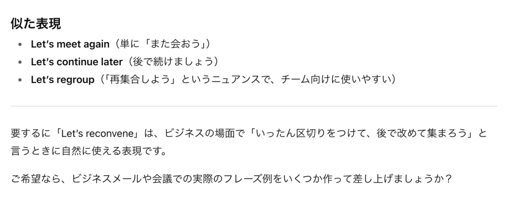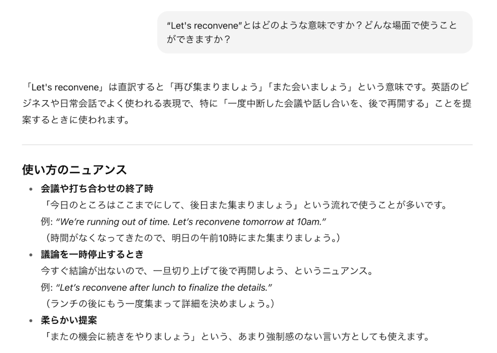 ChatGPTは「再集合する」という意味を説明した上で、その他の実用的な例文まで提示してくれます。これにより、単語帳では学べない“生きた使い方”を習得できます。