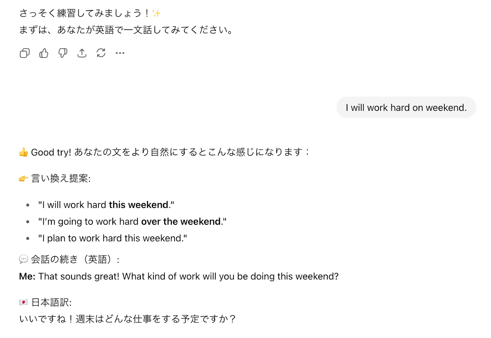 このように頼むと、自分が使った表現に対して「もっと自然にはこう言うよ」と直してくれるので、会話の流れを止めずに新しいフレーズを学べます。