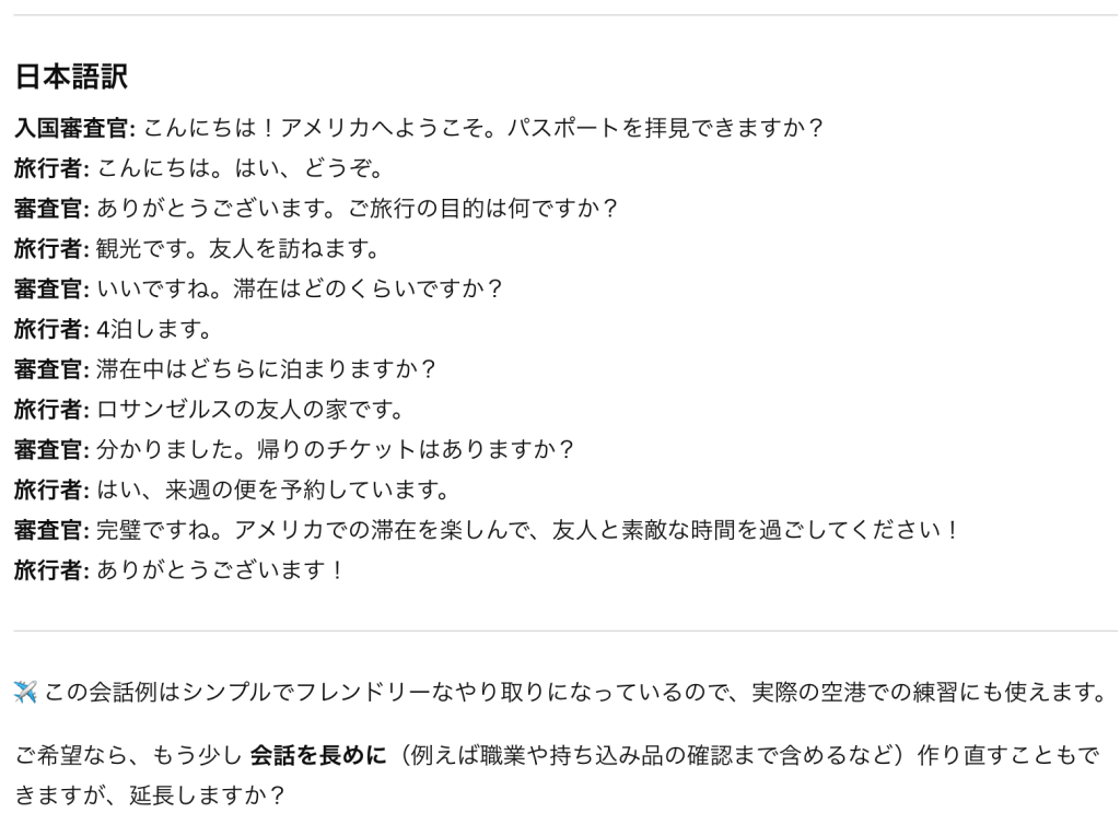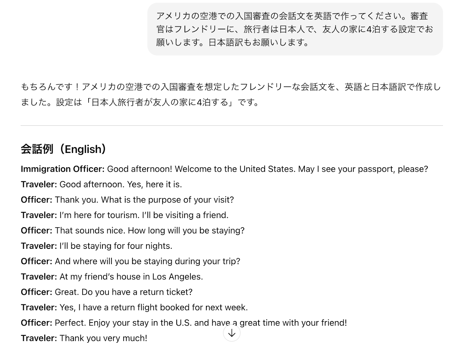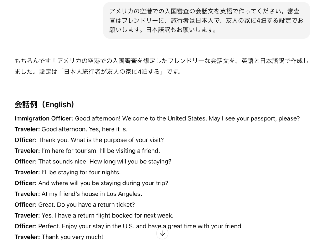 英会話はアウトプットも大事ですが、必要なシーンを想定した会話文をインプットすることも重要です。ChatGPTなら「空港での入国審査」「オンライン会議」など、自分の状況に合った会話文をいくらでも作ってもらえます。